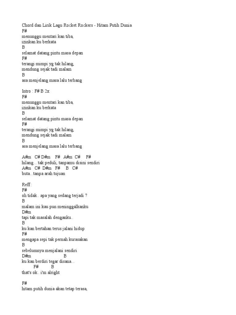 Lirik Lagu Rocket Rockers Hitam Putih Dunia Dan Kunci Gitar - Lirik Chord Lagu Mix 1 - G pintu masa depan g terangi mimpi yg tak .. Free printable and easy chords for song by rocket. G menunggu mentari kan tiba, izinkan ku berkata c selamat datang pintu masa depan g terangi mimpi yg tak hilang, mendung sejak tadi malam c . A izinkan ku berkata b selamat datang pintu masa depan f# terangi mimpi yg tak hilang. Kunci gitar rocket rockers dia. F# menunggu mentari kan tiba, izinkan ku berkata.